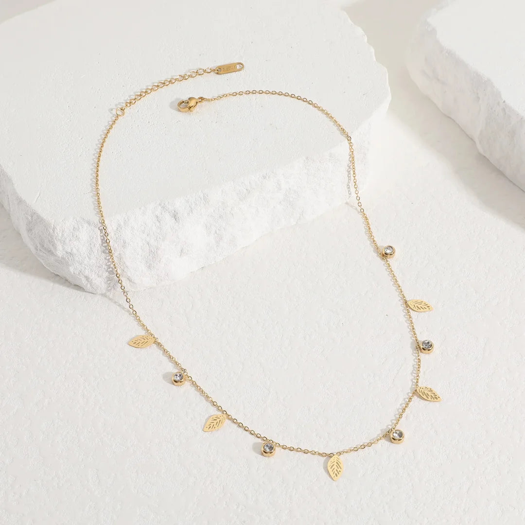 Embrace the beauty of nature with this delicate gold leaf necklace. The shimmering leaves, adorned with sparkling cubic zirconia stones, create a timeless and elegant piece that will add a touch of natural charm to any outfit. Perfect for both casual and formal occasions, this necklace is a versatile and stylish addition to your jewelry collection.