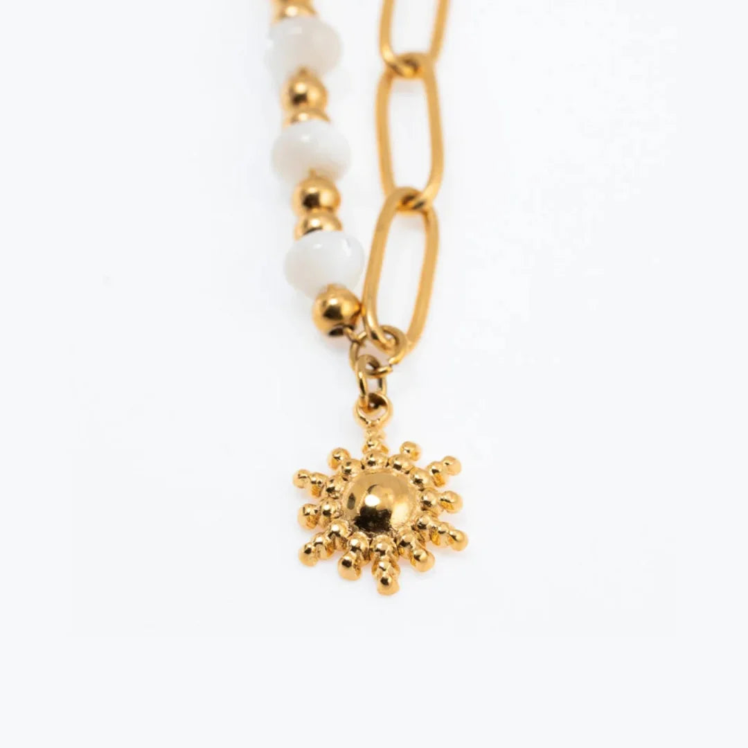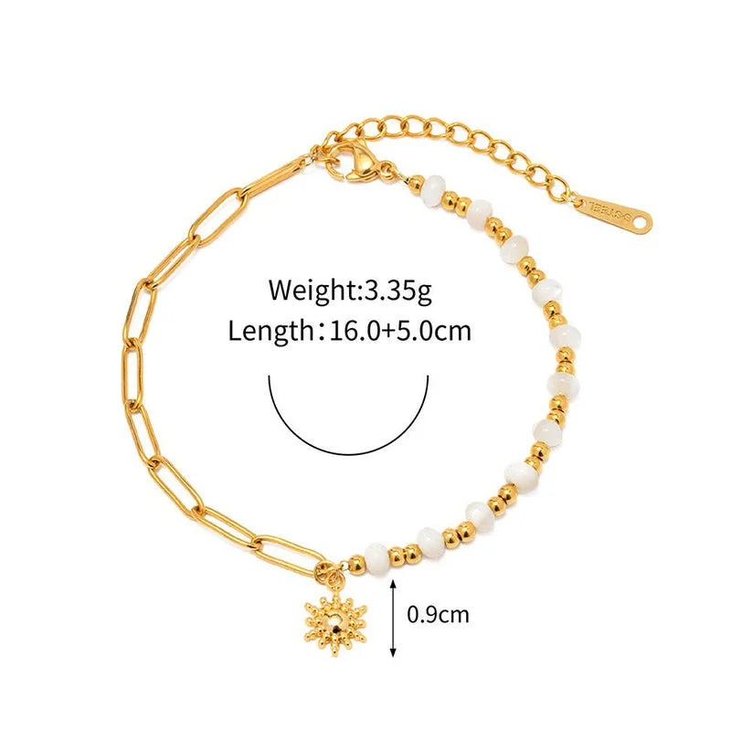 Embrace the sun-kissed vibes with this stunning gold-toned bracelet. The delicate white beads and sun charm evoke the carefree spirit of summer. Perfect for beach days, pool parties, or any outdoor adventure, this bracelet adds a touch of coastal chic to your outfit.